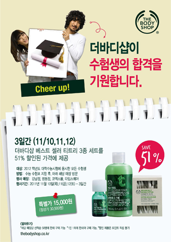티트리 오일, 티트리 스킨 클리어링 토너, 오가닉 코튼 버드 등 피부고민해결 3종 아이템으로 구성된 이번 패키지는, 수험생을 위해 기존 정상가에서 50%이상 할인된 가격으로 파격 제공될 예정이다.
