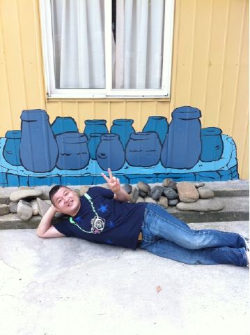 사진 속 강호동은 항아리가 그려진 벽 앞에 누워 포즈를 취하고 있다. 손으로 브이(V)자를 그리며 환하게 웃는 모습이 보는 이의 마음을 안타깝게 만든다.
