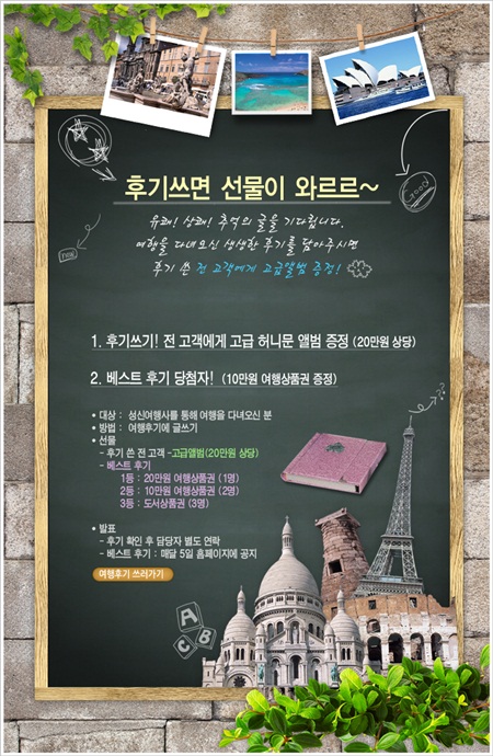다양한 이벤트 가운데 '여행후기' 이벤트가 있다. 홈페이지 내 게시판에 사진 또는 글로 여행의 감동을 생생하게 표현한 이들을 대상으로 100% 경품 증정 이벤트 및 추첨을 통해 베스트 후기 당첨자들에게 여행상품권 등을 제공한다.