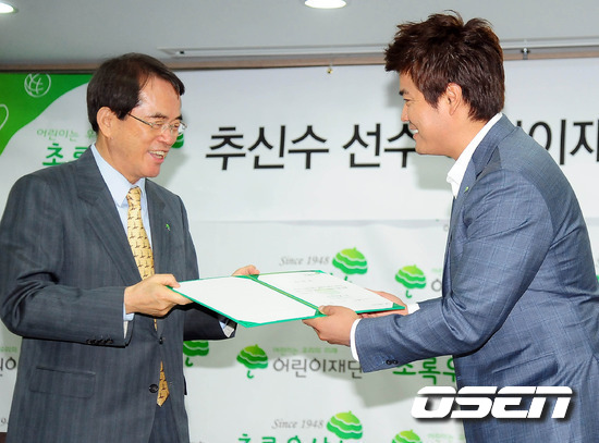 [OSEN= 백승철 인턴기자] '추추트레인' 추신수(29, 클리블랜드 인디언스)가 10일 오전 서울 무교동 어린이재단 대회의실에서 열린 '추신수 선수 어린이재단 홍보대사 위촉식'에서 홍보대사 위촉장을 이제훈 어린이재단 회장에게 전달받고 있다.