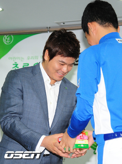 [OSEN= 백승철 인턴기자] '추추트레인' 추신수(29, 클리블랜드 인디언스)가 10일 오전 서울 무교동 어린이재단 대회의실에서 열린 '추신수 선수 어린이재단 홍보대사 위촉식'에 참석 김신호 군으로 부터 빼빼로데이를 앞두고 선물을 받고 있다.