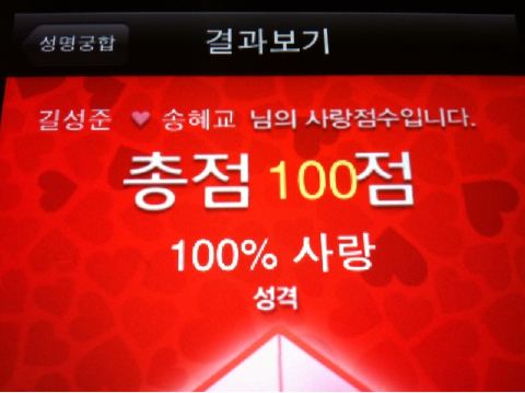 사진에는 길과 송혜교의 성명궁합 결과가 나와있다. 궁합 점수가 총점 100점을 기록하며 송혜교와 길의 완벽한 사랑을 나타내주고 있어 보는 이의 웃음을 자아낸다.