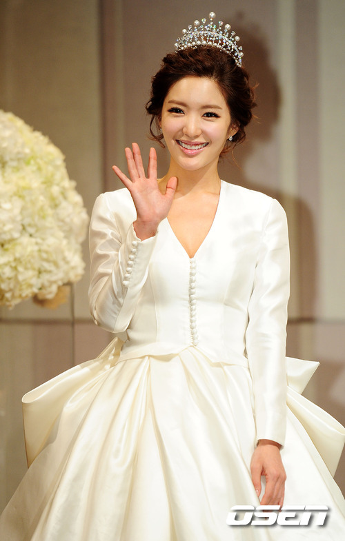 결혼식에 앞서 서지영이 기자회견을 가지며 포즈를 취하고 있다.