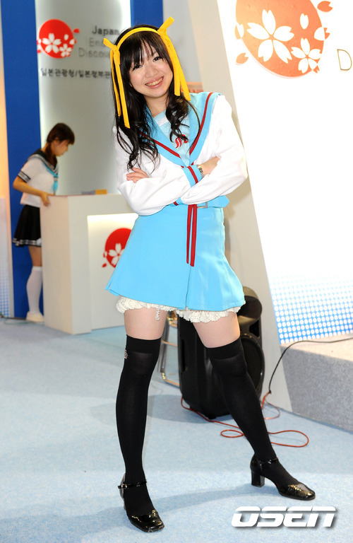 일본 관광청 부스에서 홍보 모델이 포즈를 취하고 있다.