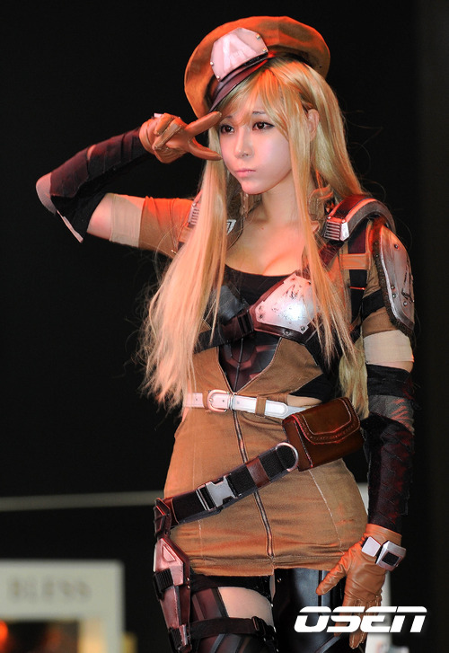 게임 개발사 '네오위즈' 부스에서 모델 조세인이 포즈를 취하고 있다.
