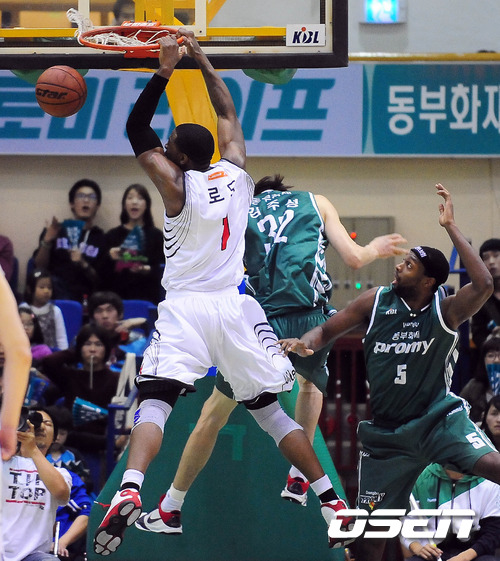 [OSEN=원주 ,백승철 인턴기자] 10일 오후 원주 치악체육관에서 열린 '2011-2012 KB국민카드 프로농구' 원주 동부 프로미와 부산 KT 소닉붐의 경기 2쿼터 KT 로드가 덩크슛을 하고 있다.