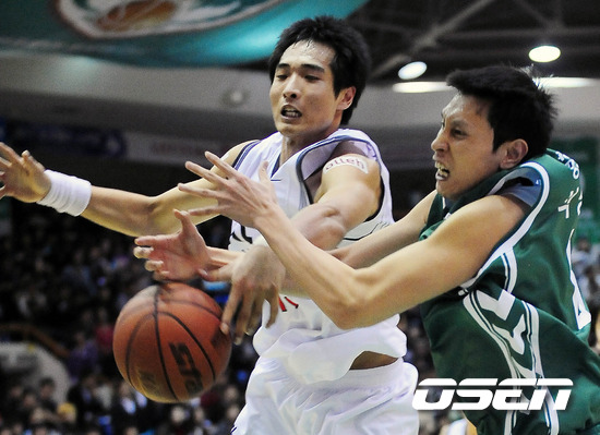 [OSEN=원주 ,백승철 인턴기자] 10일 오후 원주 치악체육관에서 열린 '2011-2012 KB국민카드 프로농구' 원주 동부 프로미와 부산 KT 소닉붐의 경기 4쿼터 동부 석명준과 KT 김현민이 볼다툼을 하고 있다.
