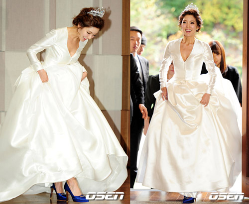 또 이와는 반대로 실크 소재의 푸른색 펌프스를 신어 ‘순백의 신부’의 이미지에 반전을 꾀했으며 내추럴한 묶음 머리 위로 진주와 크리스탈 장식이 곁들어진 티아라를 선택해 화려함을 더했다.