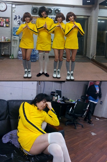 사진 속 김장훈은 노란색 미니원피스를 입은 오렌지캬라멜 멤버들과 의상, 가발까지 맞춰 입고 나란히 포즈를 취하고 있다. 상큼한 분위기의 오렌지캬라멜 멤버들 못지 않는 발랄한 표정과 날씬한(?) 바디라인이 특히 눈길을 사로 잡는다.