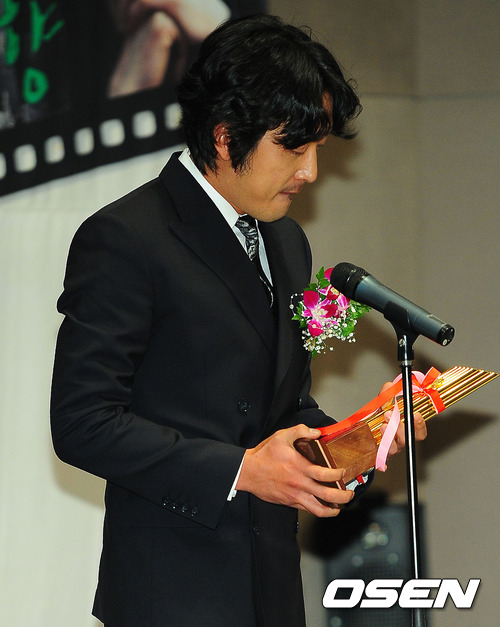 11일 오후 서울시 종로구 태평로 프레스센터 국제회의실에서 열린 제 31회 영화 영평상 시상식에서 남우연기상을 수상한 하정우가 수상 소감을 말하던 중 트로피를 바라바고 있다.