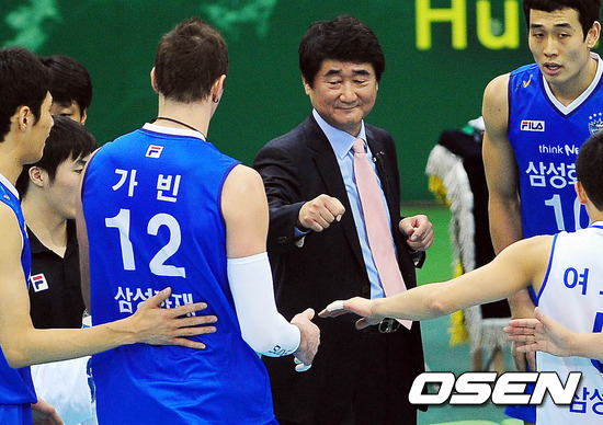 12일 오후 수원 실내체육관 열린 2011-2012 NH농협 V-리그 남자부 KEPCO45와 삼성화재의 경기 3세트 삼성화재 신치용 감독이 가빈과 주먹을 마주치고 있다.