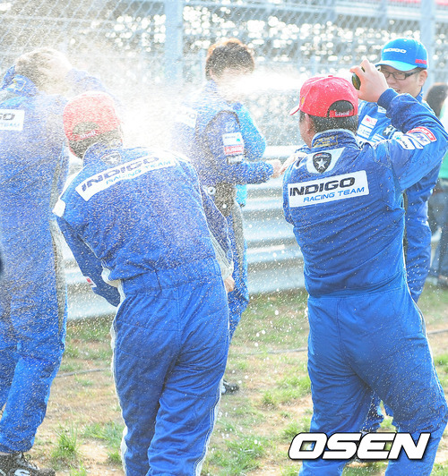 12일 전라남도 영암군 삼호읍 영암 코리아 인터내셔널 서킷 상설트랙에서 열린 ‘코리아 스피드 페스티벌(KSF)’ 최종전에서 김연아가 제네시스 쿠페 챔피언십 파이널 시상을 한 후 1위 최명길(인디고)과 3위 오일기(인디고)가 팀 동료들과 샴페인을 터트리며 기뻐하고 있다.