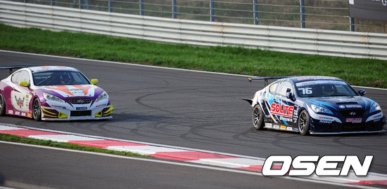 12일 전라남도 영암군 삼호읍 영암 코리아 인터내셔널 서킷 상설트랙에서 열린 ‘코리아 스피드 페스티벌(KSF)’ 최종전에서 제네시스 쿠페 오일기(인디고,오른쪽)와 황진우(DM레이싱, 왼쪽)이 치열한 선두다툼을 하고 있다.