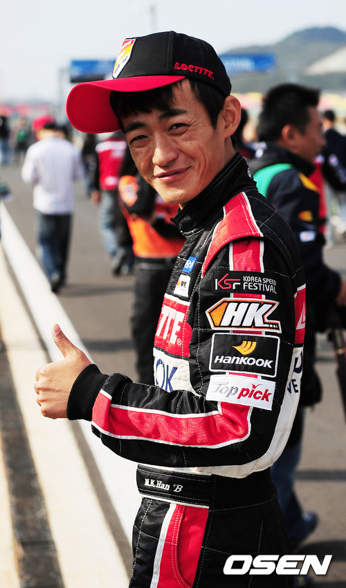 12일 전라남도 영암군 삼호읍 영암 코리아 인터내셔널 서킷 상설트랙에서 열린 ‘코리아 스피드 페스티벌(KSF)’ 최종전에서 제네시스 쿠페 챔피언십에 참가하는 한민관이 취재진에게 엄지손가락을 치켜들고 있다.