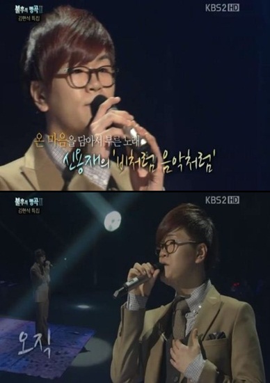 12일 오후 방송된 KBS 2TV ‘자유선언 토요일-불후의 명곡2: 전설을 노래하다(이하 불후2)’에서는 故 김현식 추모특집편을 마련했다. 이날 신용재는 김현식의 ‘비처럼 음악처럼’을 미션 곡으로 선택해 열창했다.