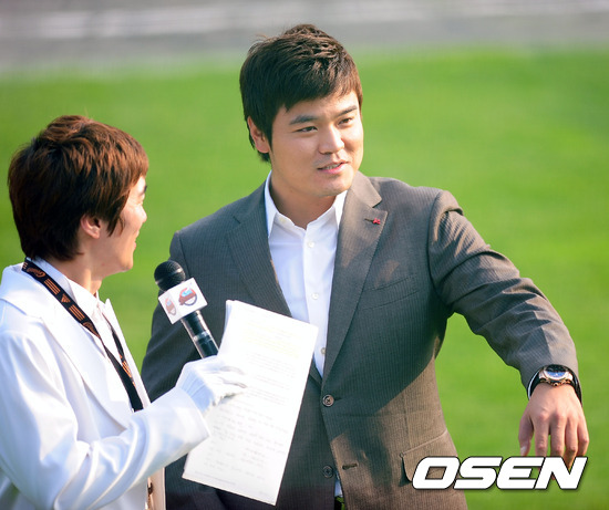 13일 부산 사직구장에서 열린 전통적인 야구 라이벌 부산고 대 경남고 경기에서 추신수가 팬들에게 사인볼을 주기 위해 그라운드로 나왔으나 어깨부상으로 직접 못던진다는 것을 설명하고 있다.