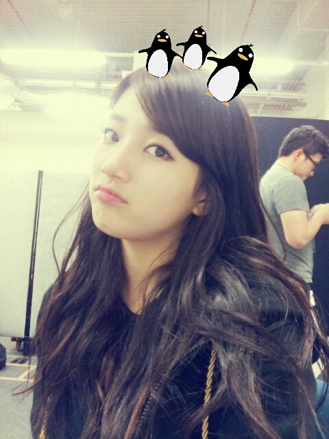 사진 속에 수지는 귀여운 표정을 지으며 카메라를 응시하고 있다. 특히 자신의 머리 위에 펭귄을 그려 넣어 웃음을 자아낸다.
