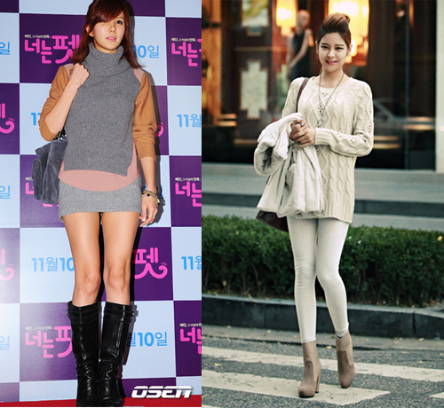 애프터스쿨의 정아는 카멜과 그레이가 배색된 터틀넥 티셔츠에 짧은 하의와 워커부츠를 매치해 여성스러움과 매니시함이 공존하는 니트 패션으로 가을여자의 느낌을 물씬 풍겼다.