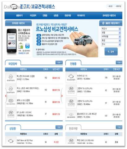 업계 최초로 선보이는 시스템인 중고차 비교견적 서비스는 르노삼성차 전국 204개의 영업 지점에서 고객에게 위탁받은 중고차를 온라인상에서 비교해 견적을 내는 서비스다.