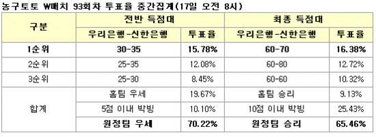 2011-2012 시즌 농구토토 W매치 93회차 투표율 중간집계 결과. 최종 득점대 60-70점대 신한은행 승리 예상 16.38% 로 최다…18일(금) 발매 마감