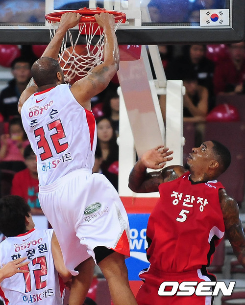18일 오후 안양실내체육관에서 열린 '2011-2012 KB국민카드 프로농구' 안양 인삼공사와 서울 SK의 경기 2쿼터 SK 존슨이 덩크슛을 하고 있다.