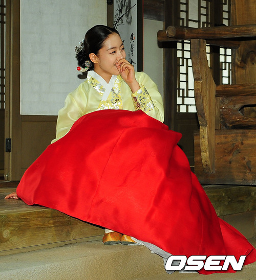 18일 오후 경기도 이천시 무대마당 스튜디오에서 열린 jTBC 개국 주말 특별기획드라마 '인수대비'의 촬영현장에서 어린 인수대비 역을 맡은 함은정이 계단을 오르던 중 실수로 넘어진 후 "아이 부끄러워"라고 말하고 있다.