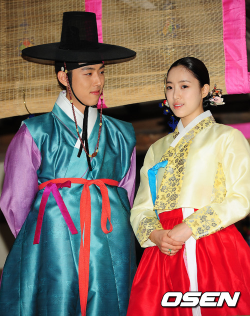 18일 오후 경기도 이천시 무대마당 스튜디오에서 열린 jTBC 개국 주말 특별기획드라마 '인수대비'의 촬영현장에서 수양대군의 장남 도원군 역을 맡은 백성현과 어린 인수대비 역을 맡은 함은정이 포토타임을 갖고 있다.