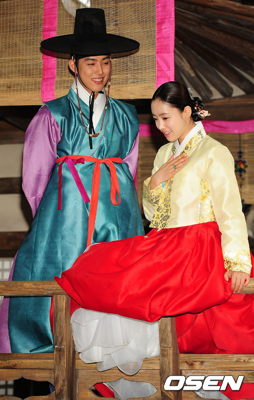 18일 오후 경기도 이천시 무대마당 스튜디오에서 열린 jTBC 개국 주말 특별기획드라마 '인수대비'의 촬영현장에서 수양대군의 장남 도원군 역을 맡은 백성현과 어린 인수대비 역을 맡은 함은정이 포토타임을 갖고 있다.