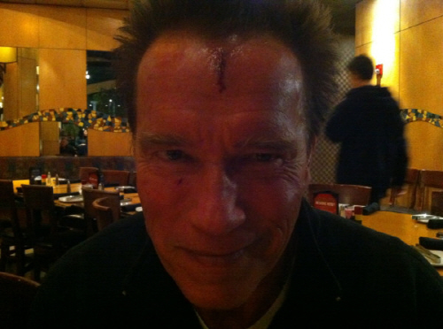 사진 속 슈왈제네거 모습은 마치 ‘터미네이터’ 속 T-800을 연상케 한다. 이마 부분이 찢어진 듯해 예상보다 영화에 위험한 장면이 많음을 간접적으로 드러냈다. 다행스럽게도 많이 다치지는 않은 상황이다.