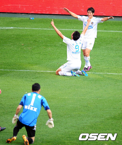 [OSEN=손용호 기자,서울월드컵경기장] 2011 K-리그 6강플레이오프 첫 경기 FC 서울-울산 현대 전반 울산 김신욱이 팀의 두번째 골을 넣고 환호하고 있다.