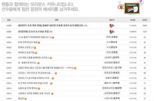 고양 오리온스의 팬들이 19일 구단의 공식 홈페이지에 설치된 게시판을 통해 무관중 운동을 추진하고 있다.