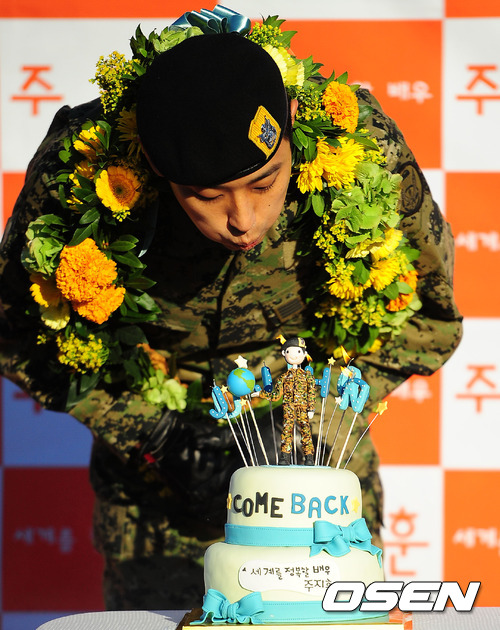 21일 오전 서울 송파구 장지동 특전사령부에서 군 제대한 배우 주지훈이 팬들이 마련한 제대 축하 케이크의 불을 끄고 있다.