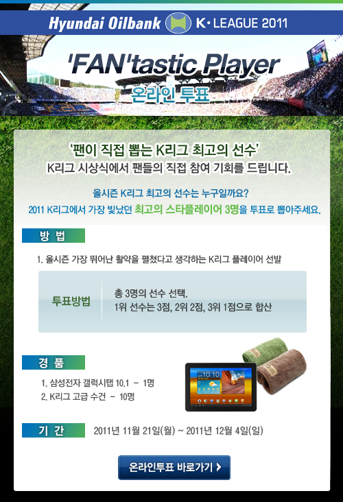 한편 축구팬이 뽑은 올 시즌 최고의 K리거 '팬타스틱 플레이어'는 오는 다음달 6일 서울 서대문구 홍은동 그랜드힐튼호텔에서 열리는 '2011 현대오일뱅크 K리그 대상' 시상식에서 발표된다.