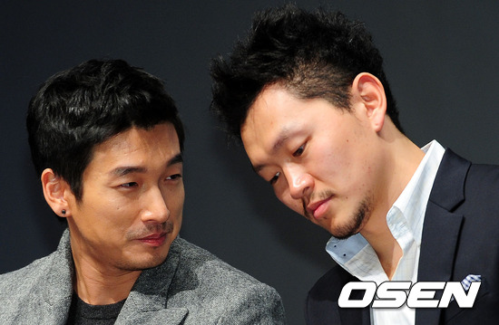 조승우 양동근이 간담회 도중 귓속말을 나누고 있다.