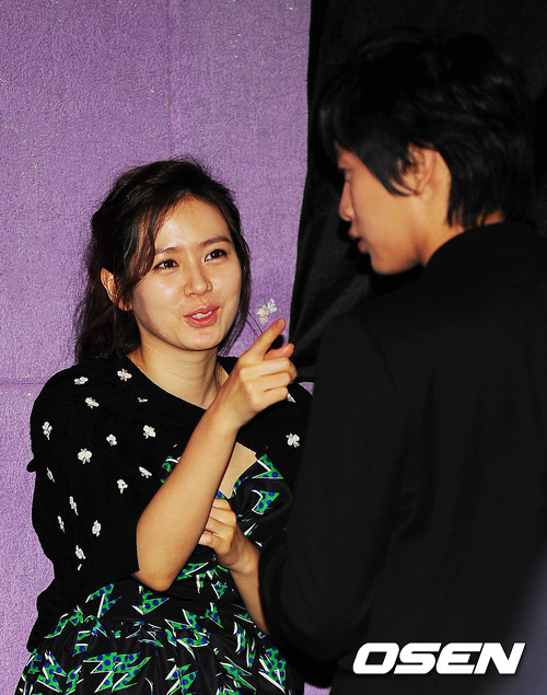 21일 오후 서울 왕십리 CGV에서 열린 영화 '오싹한 연애' 시사회에서 포토타임을 기다리던 손예진과 이민기가 무대 뒤에서 즐겁게 얘기를 나누고 있다.