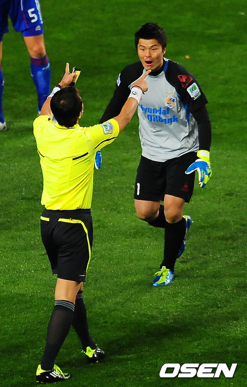 23일 오후 수원월드컵경기장에서 열린 'K리그 2011 준플레이오프' 수원 삼성과 울산 현대의 경기에서 수원 오장은에게 반칙을 하며 옐로우 카드를 받고 페널티킥 기회를 내준 울산 김영광 골키퍼가 아쉬워하고 있다.