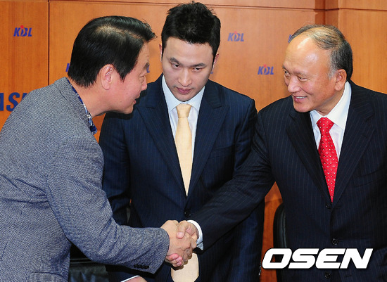 [OSEN = 백승철 기자] 24일 오전 서울 논현동 한국프로농구연맹 KBL 센터에서 열린 김승현 기자회견에서 한선교 KBL 총재와 심용섭 오리온스 단장이 악수를 나누고 있다.