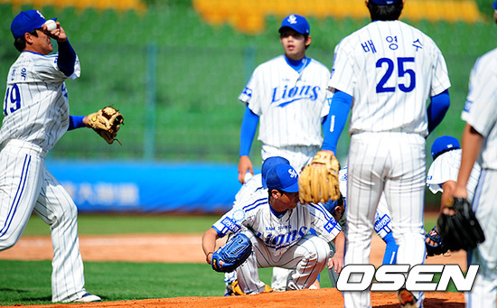 삼성 투수진이 수비훈련 도중 정현욱의 2루 송구에 깜짝 놀라며 몸을 숙이고 있다.