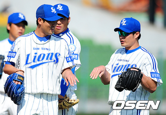 삼성 장원삼과 오승환이 이야기를 나누고 있다.
