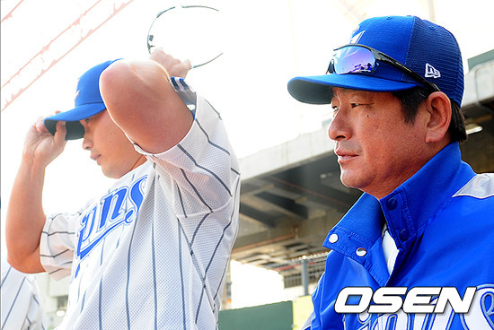 삼성 류중일 감독과 오승환이 그라운드에 들어서고 있다.