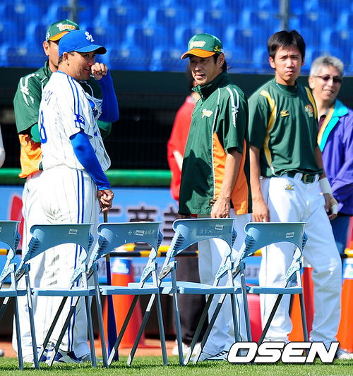 삼성 오치아이 코치가 대만 퉁이 코칭스태프와 이야기를 나누고 있다.