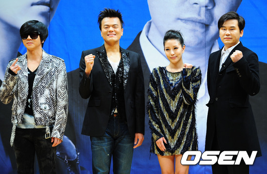 24일 오후 서울 SBS 목동사옥에서 열린 SBS 서바이벌 오디션 ‘일요일이 좋다-'서바이벌 오디션 K팝스타(이하 K팝 스타)’ 제작발표회에서 윤도현 박진영 보아 양현석이 포토타임을 갖고 있다.