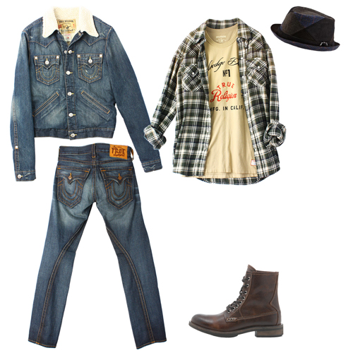 멋진 중절모와 터프한 부츠, 핏이 넉넉한 데님에서 연상되는 분위기는 얼마든지 시도 할 수 있다. 베이직한 라운드 티셔츠에 체크 셔츠로 캐주얼함을 강조한 후 포켓의 디테일이 눈에 띄는 데님으로 포인트를 더한다.