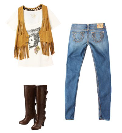여성의 라인을 가장 잘 살려준 트루릴리젼의 스키니 진은 옐로우 스티치가 빈티지하면서 클래식한 느낌을 준다. 여기에 델마와 루이스 같이 여성캐릭터가 스케치 되어있는 루즈핏의 티셔츠, 웨스턴 느낌이 물씬 풍기는 베스트와 부츠를 매치하여 ‘웨스턴 시크’를 연출한다.