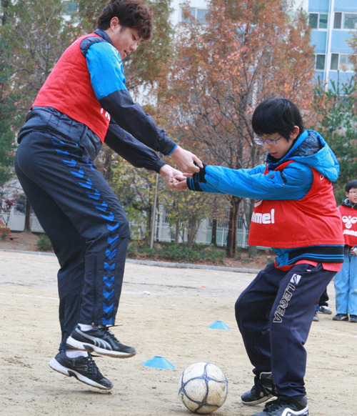 대구FC 이준희, 이광진은 지난 23일 오후 3시 U-12팀 임백규 코치와 함께 대구 동평초등학교를 방문해 방과 후 수업 일일강사로 나서 학생들과 즐거운 시간을 가졌다. 방과 후 수업은 대구가 올 2월부터 지역 내 4개 초등학교를 대상으로 실시하고 있는 프로그램으로써 유소년팀 코치들이 학교별 담당을 맡아 주 1~2회 수업으로 운영하고 있다.