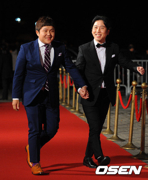 개그맨 양배추와 남창희가 레드카펫 행사를 갖고 있다.