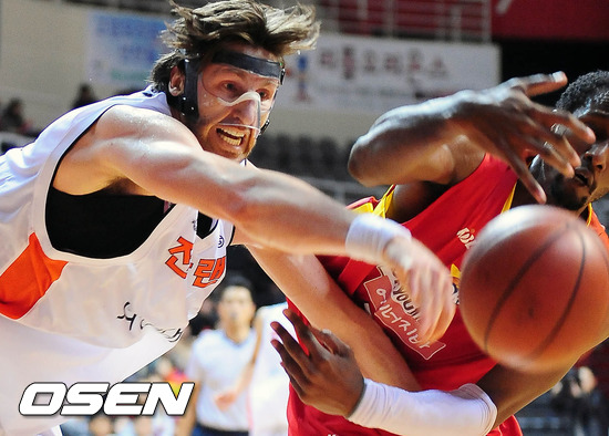 24일 오후 고양시 고양체육관서 열린 '2011-2012 KB국민카드 프로농구' 고양 오리온스와 인천 전자랜드의 경기 4쿼터 전자랜드 브로만과 오리온스 윌리엄스가 리바운드볼 다툼을 하고 있다.