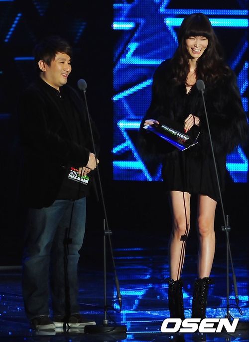 24일 저녁 서울 올림픽공원 체조경기장에서 열린 ‘2011 멜론 뮤직 어워드(이하 멜론 뮤직 어워드)’에서 작곡가 방시혁과 모델 송경아가 시상을 하고 있다.