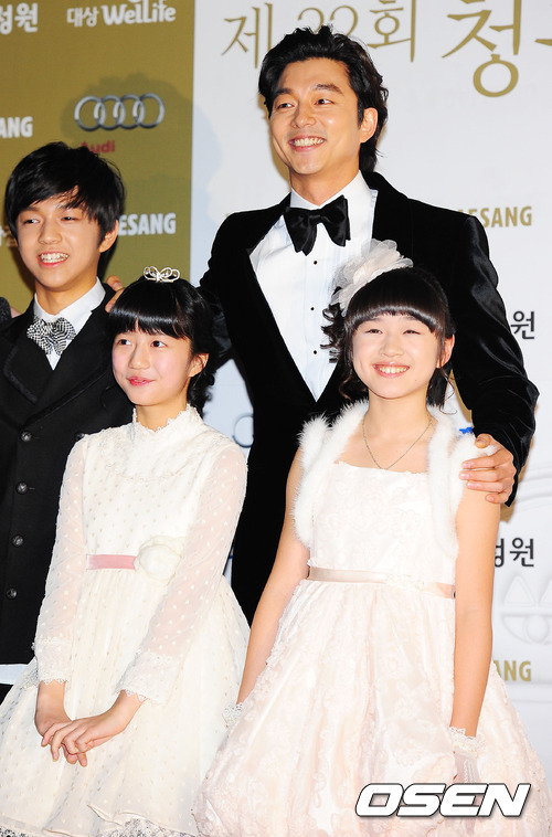 25일 오후 서울 동대문구 경희대학교 평화의 전당에서 열린 '제 32회 청룡영화상 시상식' 레드카펫 행사에서 공유가 영화 도가니의 아역 배우들과 함께 포즈를 취하고 있다.