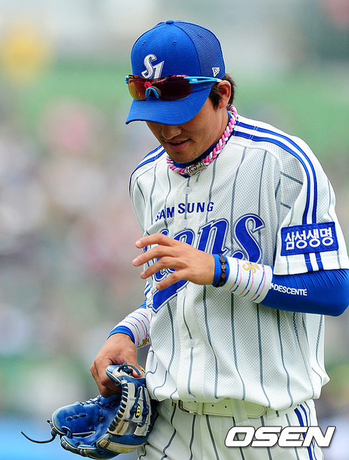 2회초 2사 만루에서 소프트뱅크 하세가와의 타구를 실책으로 놓친 삼성 김상수가 수비를 마치고 더그아웃으로 향하며 아쉬워하고 있다.